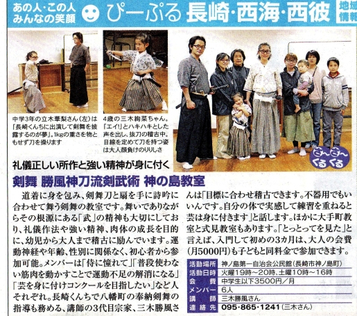 最近同じネタばかりで申し訳ありませんが、本日長崎新聞の日曜限定Magazineとっとってのコーナー「さ~さ~くるくる」に神の島教室が紹介されました。