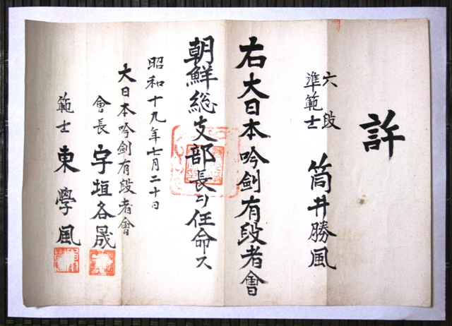 これは初代宗家が朝鮮(現在の韓国)にて、当時の大日本吟剣有段者会なるところから頂いたとされていたもので、私も先代から口伝えで聞いておりましたし、初代宗家が残したメモの中にもこの肩書が読み取れる部分を見つけておりました。
